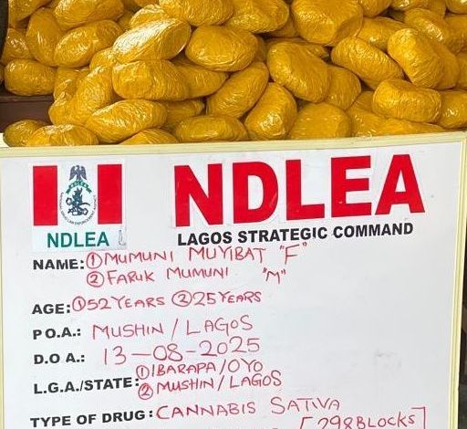 The National Drug Law Enforcement Agency (NDLEA) has arrested a 52-year-old woman, Muyibat Mumuni, and her son, Faruk, 25, in Mushin, Lagos, for allegedly storing and distributing 298 blocks of cannabis weighing 149kg.