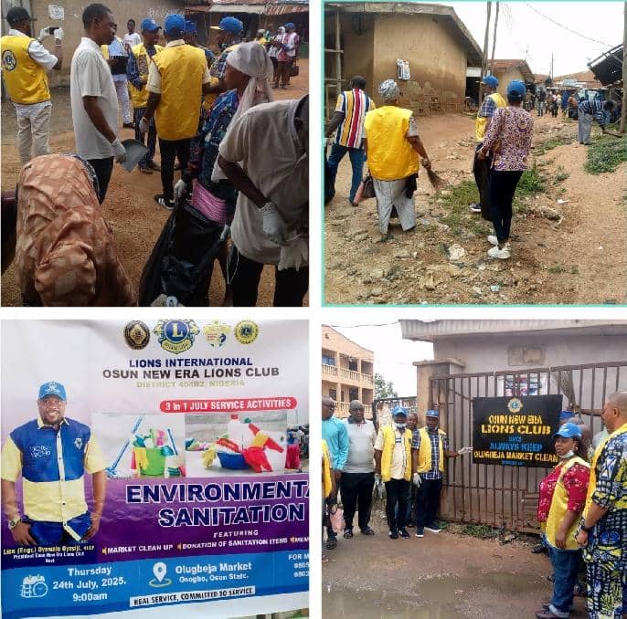 The Osun New Era Lions Club on Thursday, visited the Olugbeja Market in Osogbo where it conducted environmental sanitation exercise and donated cleaning materials to market traders, as part of its July service activities.