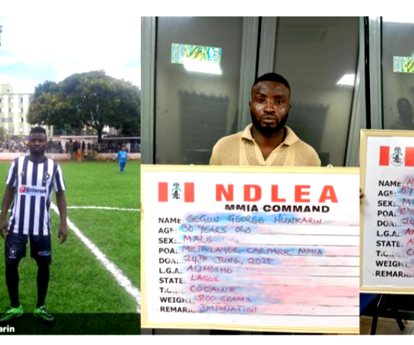 Operatives of the National Drug Law Enforcement Agency (NDLEA) have arrested an ex-international football player, Segun George Hunkarin, along with his business partner Ntoruka Emmanuel Chinedu, over an attempt to smuggle a consignment of cocaine into Nigeria through the Murtala Muhammed International Airport,(MMIA) Ikeja, Lagos.